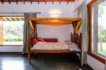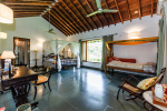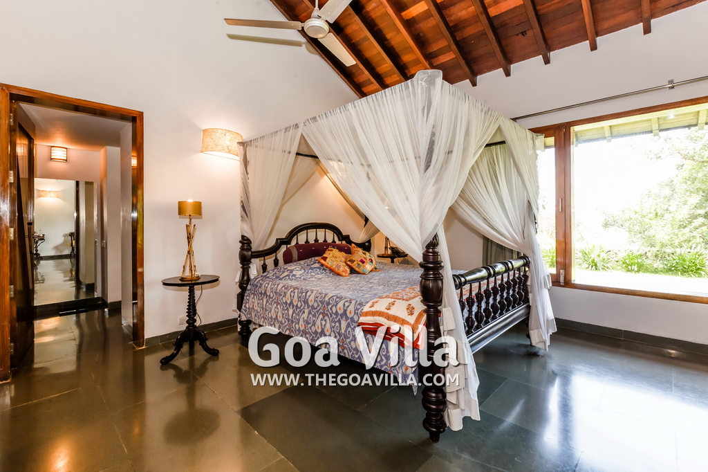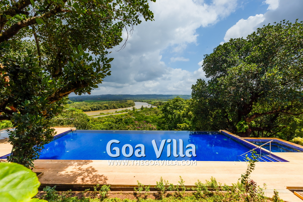 Jungle Villa 3 is a 4-bedroom luxury house for rent at Aldona in North Goa. It is part of a complex of three villas, all close to each other, with a total room capacity of 11. Located on top of a small hill, Jungle Villa 3 offers stunning views of the Mapusa River. It is a modern house with contemporary architecture. There is an infinity pool at the edge with a Jacuzzi. Traditional, well-decorated interiors with antique furniture.