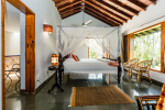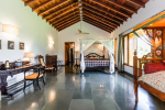 Bedrooms – All 4 bedrooms are en-suite and air-conditioned. They have antique furniture. Large comfortable beds, wardrobe, bedside table, lamp shade, sitting area, study table, and rug. The bedrooms have tea/coffee maker and other amenities. Traditional Indian thatched roof high ceiling allows plenty of air and wind flow. Bedroom 2 has a second bed for additional sleeping.