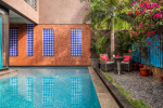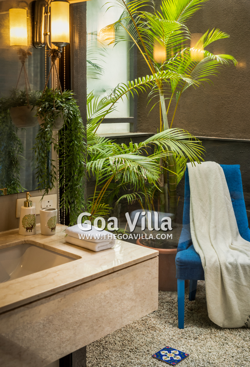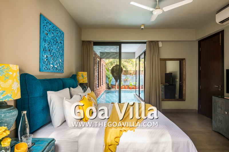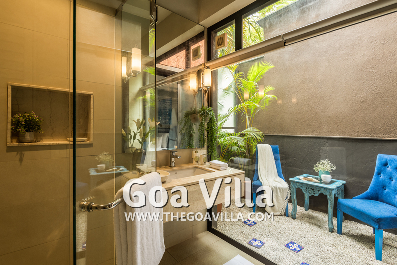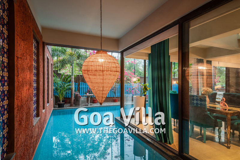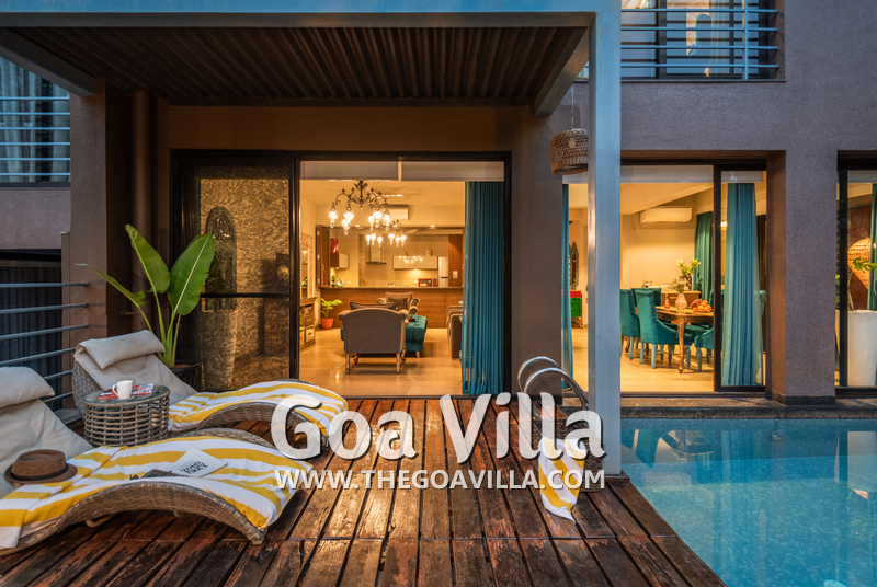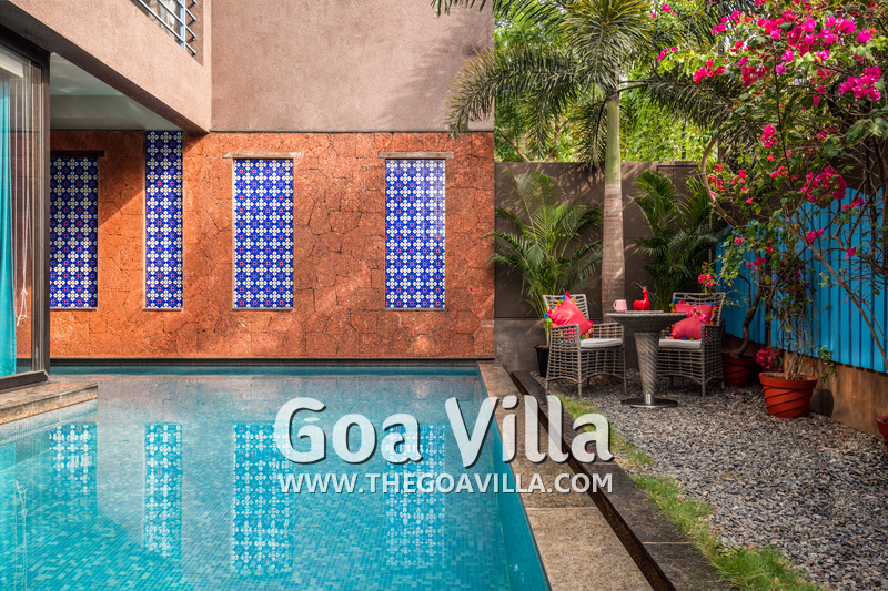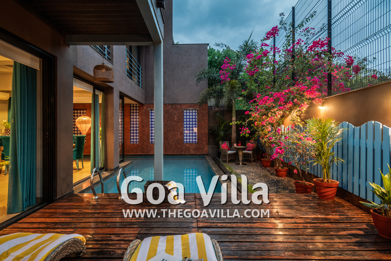 Swimming Pool – The private pool is certainly a highlight of this villa for rent in Anjuna. It surrounds the house from two sides and looks perfectly inviting for a swim. There is a wooden deck on one side with two loungers where you can relax after a swim. On the other side, there is a small garden with an outdoor lounging space.