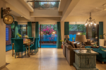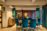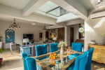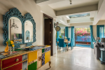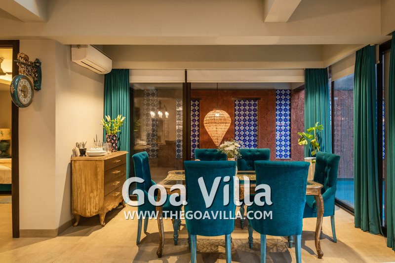 Dining, Kitchen – The dining area is located on the other corner of the living-dining space. It features an antique table and turquoise blue chairs that reflect the color of the sea. This part of the villa is also air-conditioned. The kitchen is in the next room. It has a double-door refrigerator, microwave, toaster, kettle, chimney, and other appliances.