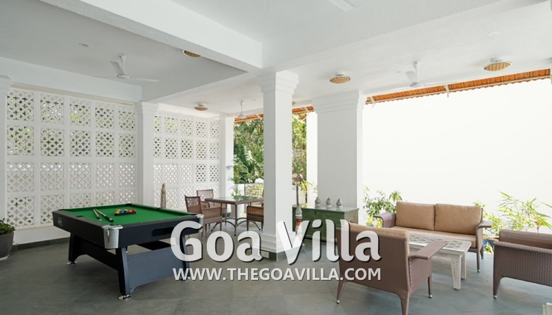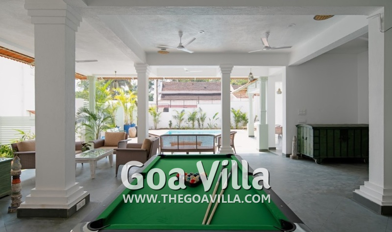 Living Room – This North Goa villa for rent has a huge open-concept room, which has the formal living area. You will find a beautifully laid-out seating area with an antique sofa and a rustic coffee table. One entire wall, just behind, has a window that provides views of the swimming pool. There is a second lounging space in the games room with a sofa. This room has a pool table, cards table, and a steam room.