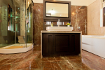 The washroom is immaculate with a bathtub, shower and a beautifully designed washbasin.